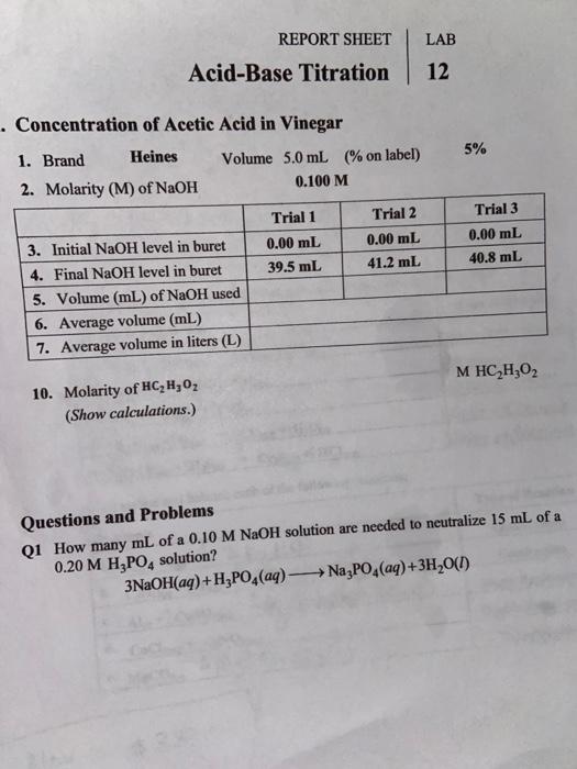 Solved Lab Report Sheet Acid Base Titration 12 Chegg Com